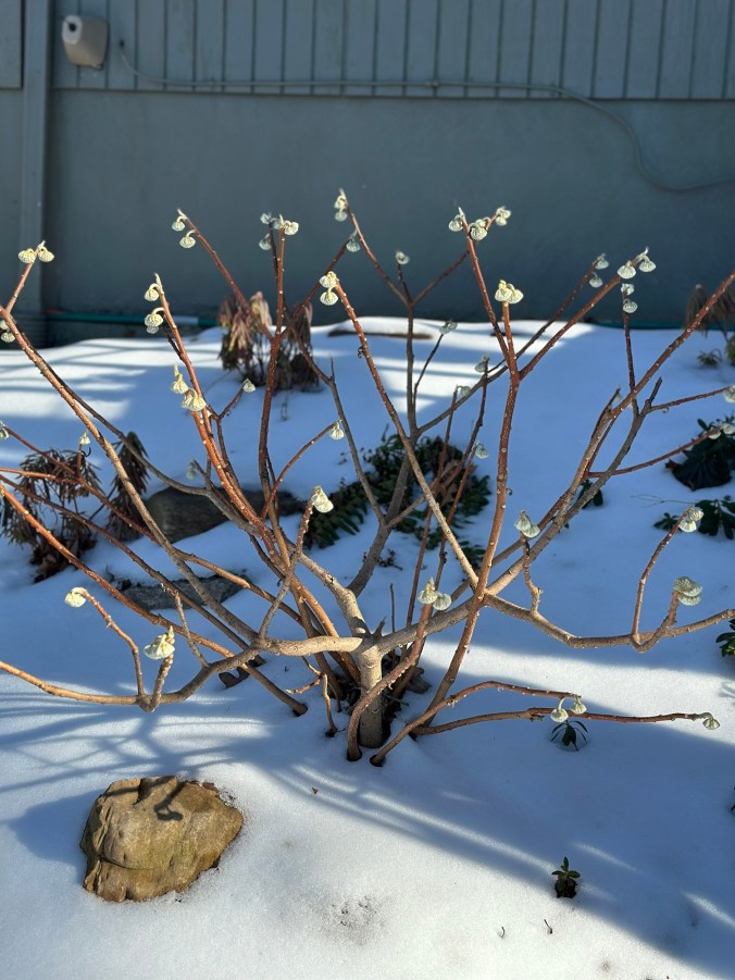 Seldom do we think of gardening in the Winter. But I am learning that every season has its merit. This Edgeworthia shrub is a winner for us. Those petit white flowers stay all winter long. In the Spring, they bear a lovely fragrance that wafts into the open window above. Summer dresses them in beautiful green leaves that provide shade for the ferns that are tucked closely underneath. And Fall colors the leaves a gorgeous gold color. But best of all? The deer will not touch it! And in our neck of the woods, that might just be the best news around!